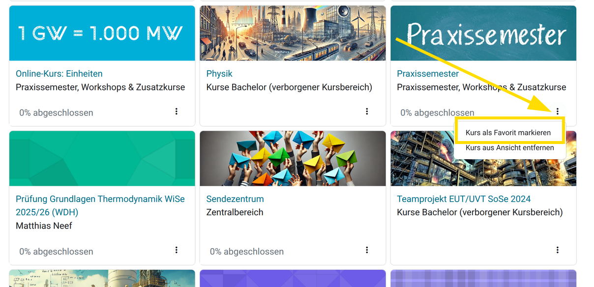 Tipp: Zu Semesterbeginn die aktiven Kurse als Favoriten markieren, am Semesterende die abgeschlossenen wieder entfernen, damit das Dashboard dauerhaft übersichtlich bleibt