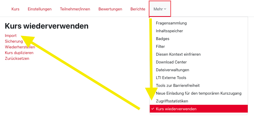 So funktioniert's: Navigieren Sie im Zielkurs über "Mehr" → "Kurs wiederverwenden" → "Import" und wählen Sie den Quellkurs aus. Entscheiden Sie dabei, ob Sie auch Nutzerdaten übernehmen möchten (in den meisten Fällen nicht empfehlenswert).