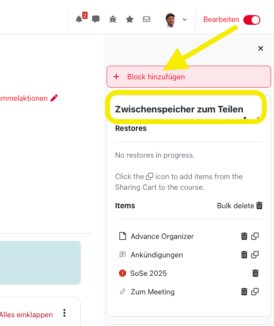 - Voraussetzung: Das Plugin "Zwischenspeicher zum Teilen" muss auf Ihrer Moodle-Instanz installiert sein