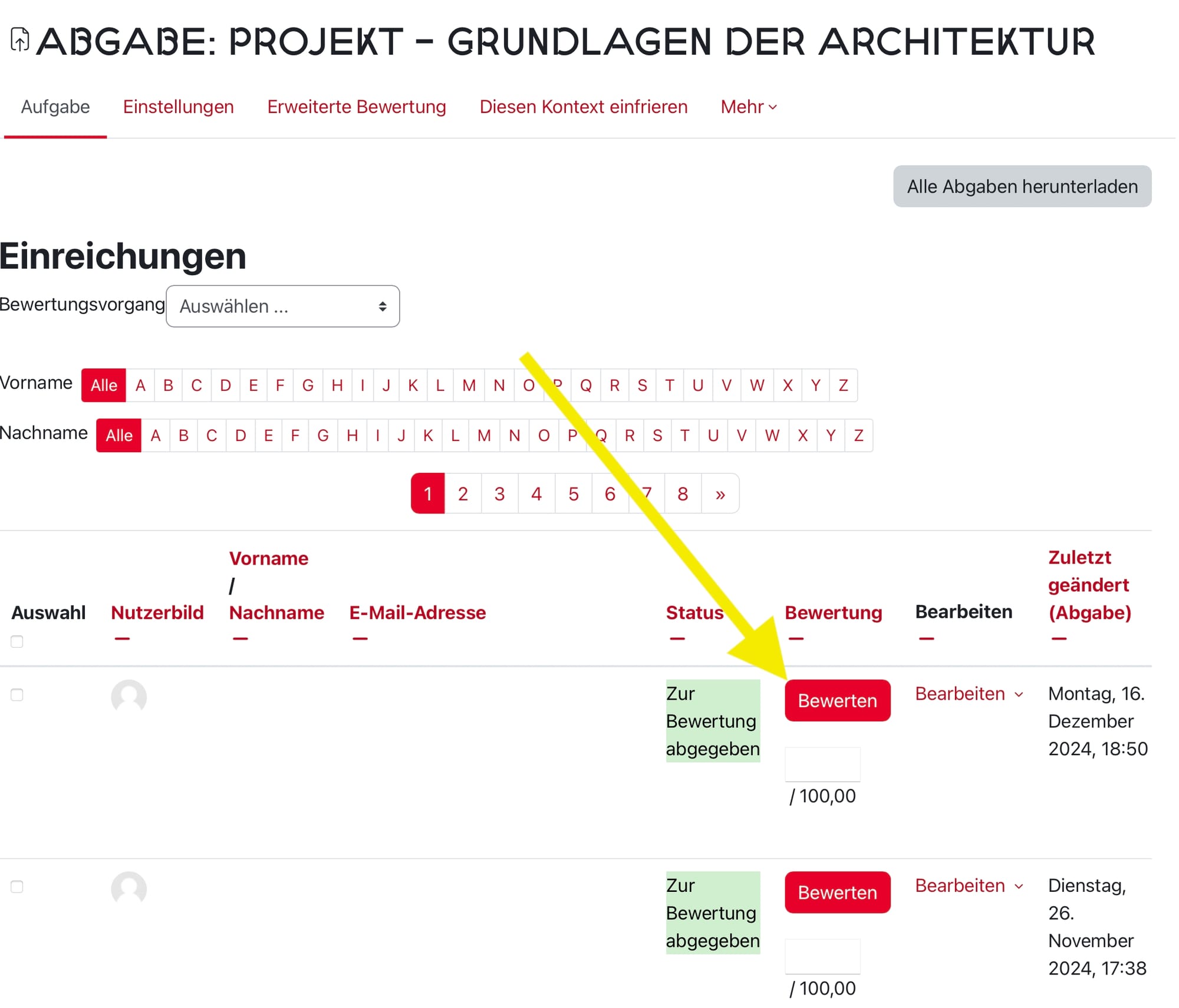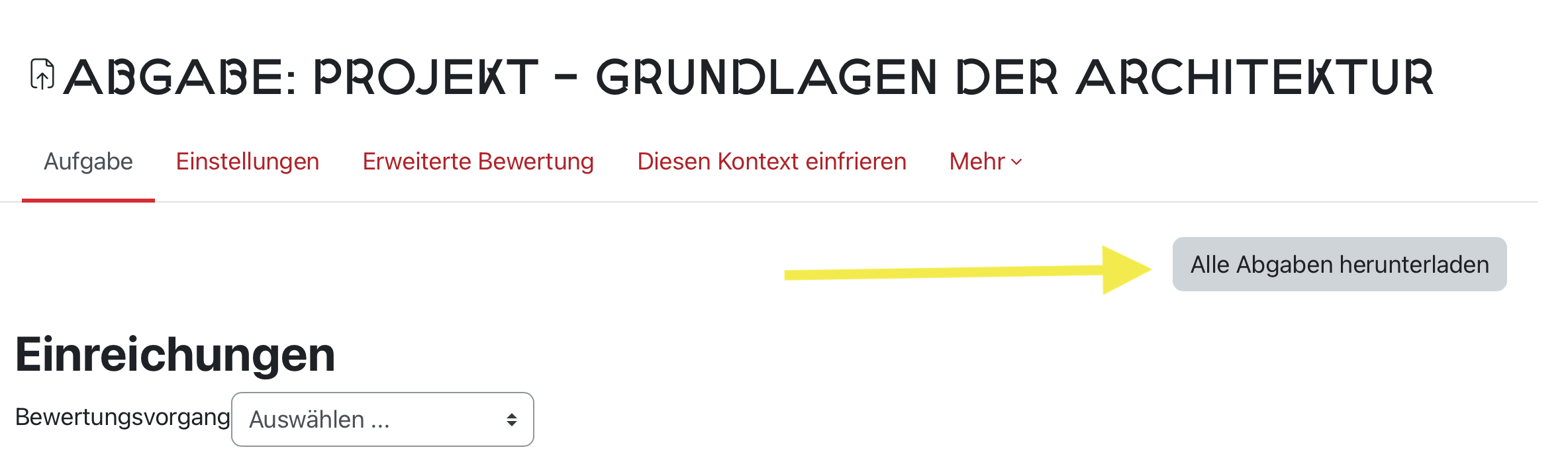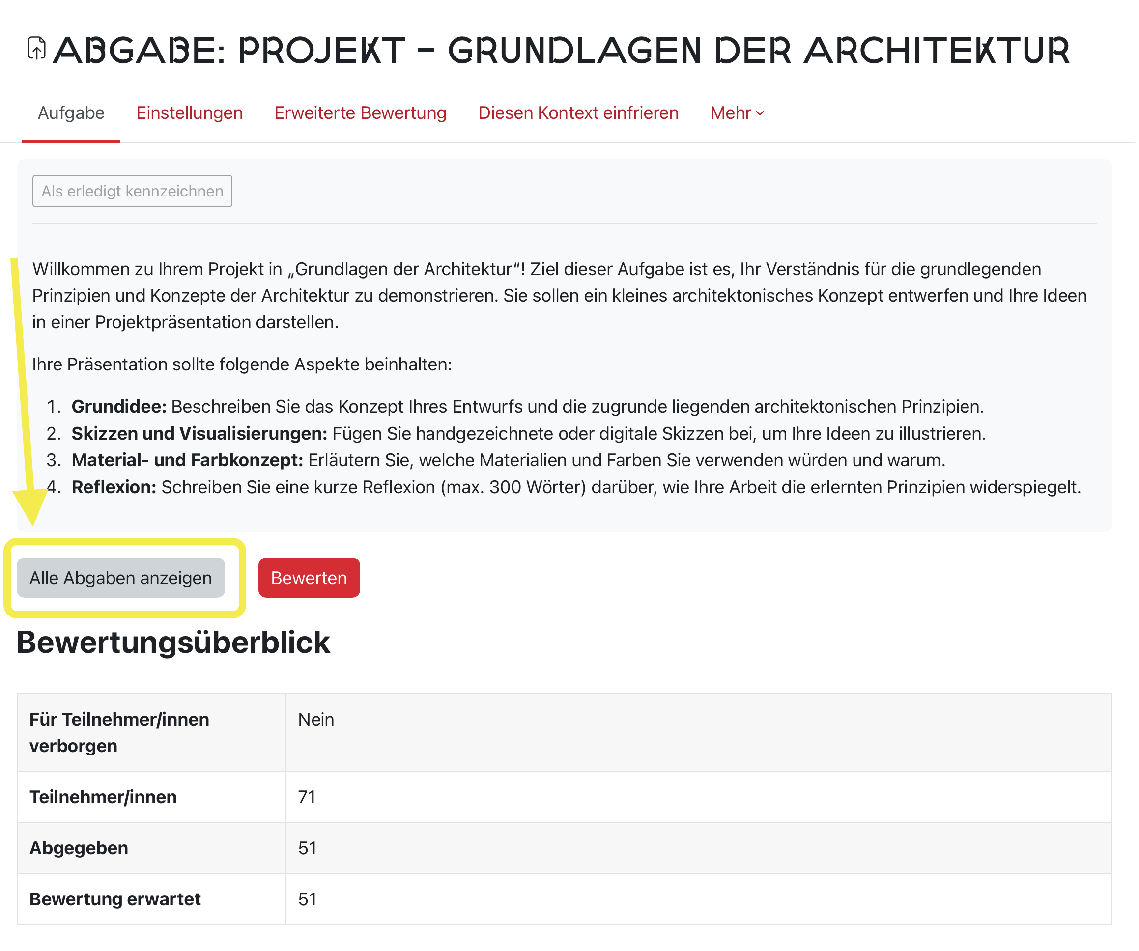 Nachdem Studierende begonnen haben, ihre Aufgaben einzureichen, können Lehrende im Kurs die Aktivität öffnen und dann auf „Alle Abgaben anzeigen“ klicken.