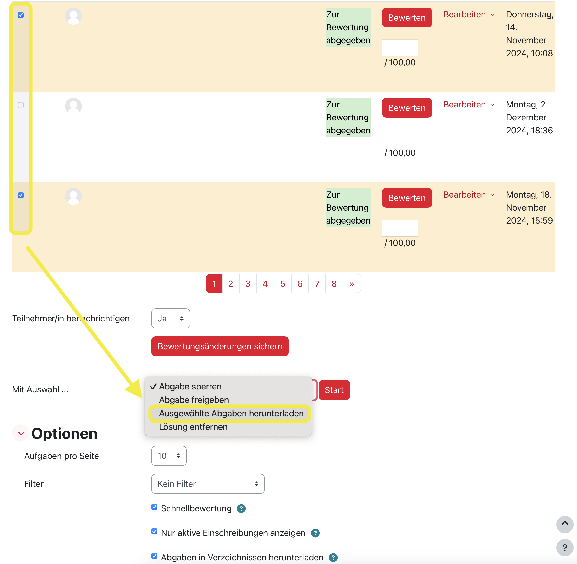 Um einzelne Arbeiten herunterzuladen, setzen Sie in der Spalte „Auswahl“ ein Häkchen neben den Namen der gewünschten Einreichungen. Scrollen Sie anschließend ans Seitenende, wählen Sie „Ausgewählte Abgaben herunterladen“ aus dem Dropdown-Menü und klicken Sie auf den Button „Start“, um den Export zu starten.