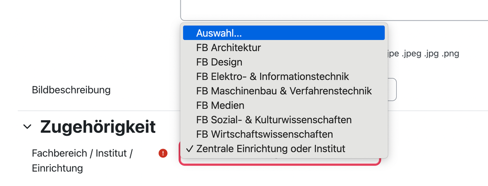 Mit Moodle 4 möchten wir die Nutzererfahrung verbessern. Da die Fachbereiche unterschiedliche Bedürfnisse haben, gibt es jetzt speziell auf die Fachbereiche abgestimmte Menüinhalte auf Moodle. Um angepasste Menüs und andere Funktionen zu ermöglichen, muss sich jedoch jeder beim ersten Login einmalig im Profil einem Fachbereich oder einer Einrichtung zuordnen.