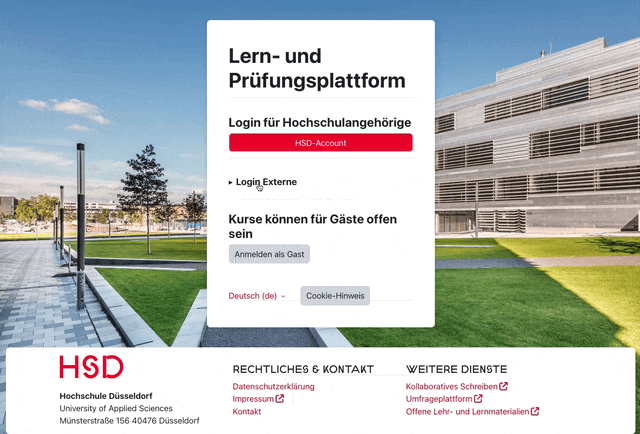 Mit unserem Moodle hat sich auch die URL geändert. Der Zugang erfolgt jetzt über https://mdl.hs-duesseldorf.de. Nutzen Sie wie gewohnt den roten Button „HSD-Account“ für den Login.